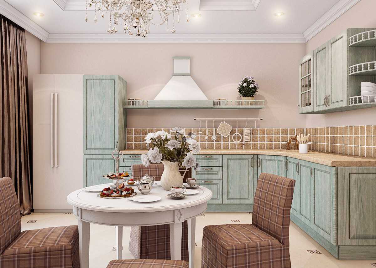 Этот стиль еще называется деревенским, так как в нем применяется немного грубая деревянная мебель, натуральные материалы (дерево, мрамор, камень), глиняная посуда, льняные шторы. Данный стиль гармонично впишется в небольшое кухонное пространство и сделает помещение красивым, функциональным и уютным.
