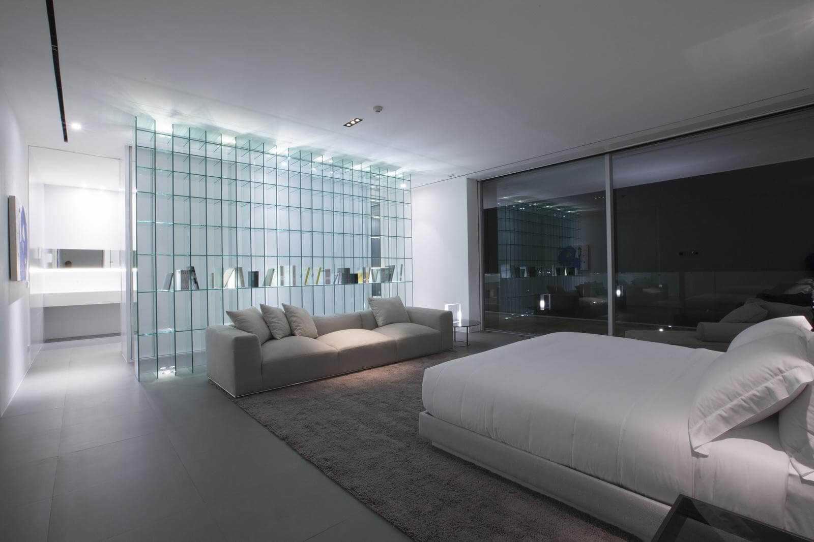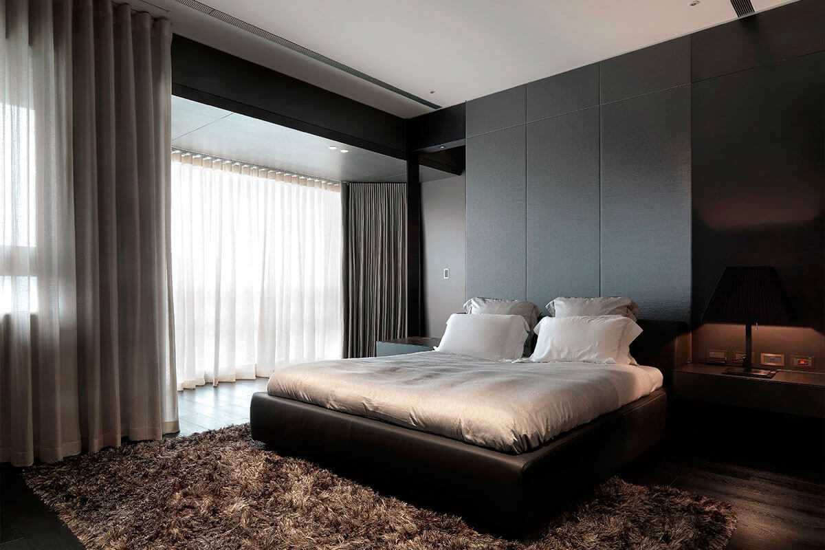 Шторы для спальни хай-тек предмет чужеродный, но если без них непривычно, выбирайте однотонные металлизированные ткани или ткань с тефлоновой пропиткой, способную держать заданную конфигурацию.