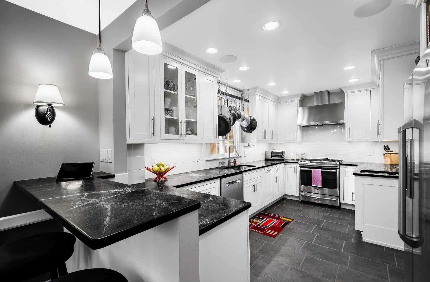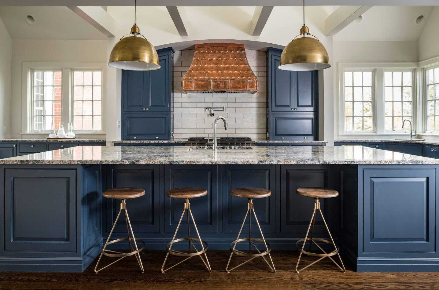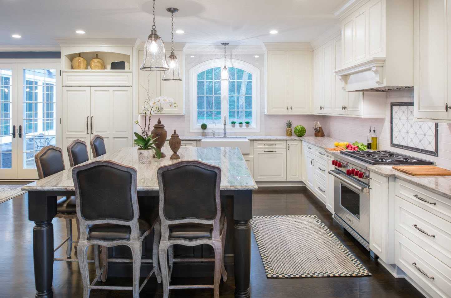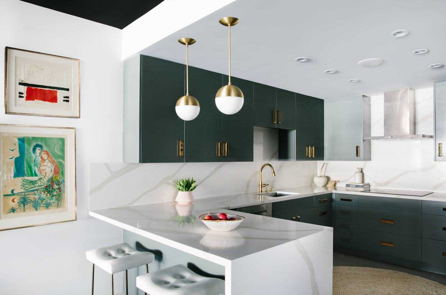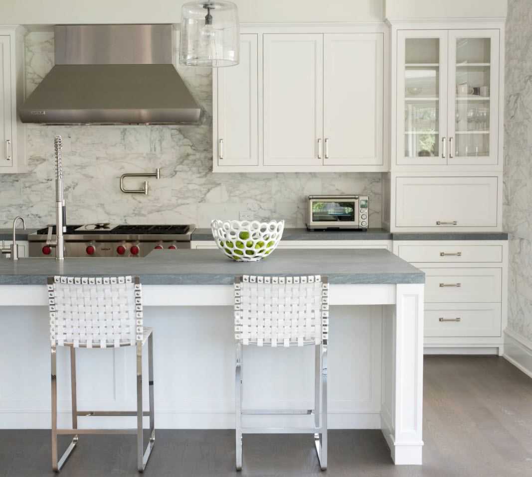 П-образная — идеально подходит для квадратной кухни. Мебель располагается вдоль трех стен, а обеденный стол выносится в середину. Если нет желания устанавливать остров или стол в середине, можно замкнуть периметр кухни барной стойкой.