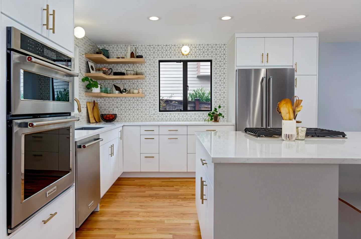 В свою очередь, кухня L гарантирует классический рабочий треугольник. Это универсальное решение, как для открытых, так и для закрытых интерьеров. Такая конструкция дает большие возможности для дальнейшего размещения пространства, например, соединяя кухню со столовой.