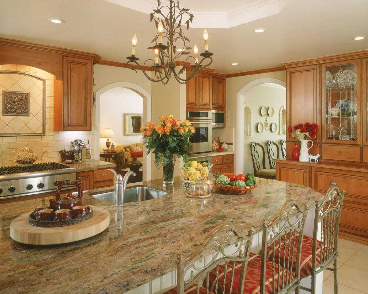 Хорошо смотрится в кухне с высоким многоуровневым потолком. Предполагает спокойные цвета, невычурную мебель с фасадами плавной формы. Для декора подойдет фарфоровая посуда и кованые элементы. Многофункциональная техника подбирается по стилю и цвету к кухонной мебели или встраивается в гарнитур.