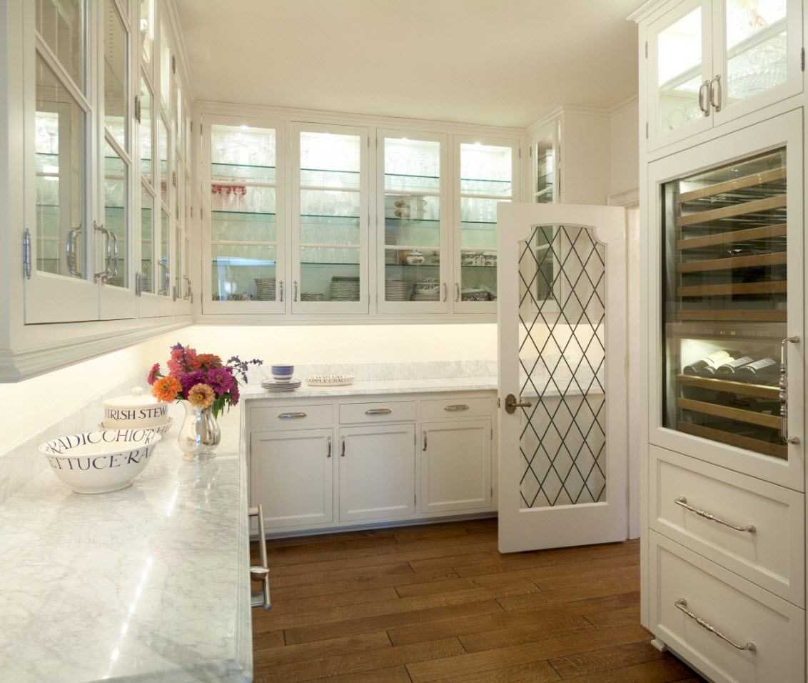- Возможно, часть нужной, но редко используемой бытовой техники можно хранить в кладовке, а столовую зону удастся обустроить в соседней комнате.