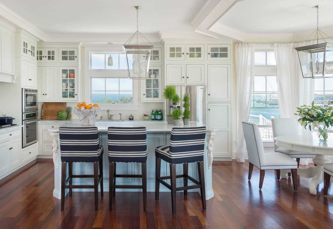 Эркер, если он имеется в квартире, идеально подходит для трапезной. Также современным считается вариант с утепленным балконом, присоединенным к кухне. Обеденная зона с диваном в таком уютном уголке понравится и домашним, и гостям.