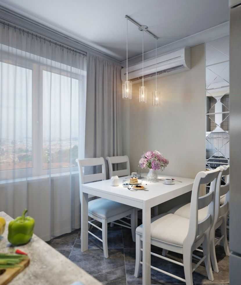 При выборе между столом и барной стойкой стоит брать в расчет все тот же недостаток места. Если вы сторонник классического стола, то будьте готовы пожертвовать свободным местом. Стулья лучше выбирать легкие, потому что в условиях тесноты их придется часто передвигать.