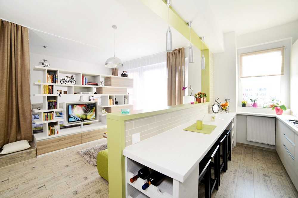 Чаще всего планировка такого помещение представляет собой разделение комнаты на две неравные части: кухонная зона и гостевая. Как правило, расположение первой определяется тем, где были проведены коммуникации. Их перенос достаточно сложное дело, а потому обычно кухня располагается именно там, где проведены соответствующие коммуникации. А вот с остальным можно экспериментировать. Остальную площадь можно задействовать под гостевую зону, место для большого обеденного стола, место отдыха, возможно, кто-то захочет предусмотреть детский уголок – все это можно совместить путем грамотного зонирования или же выбрать наиболее приоритетные решения.