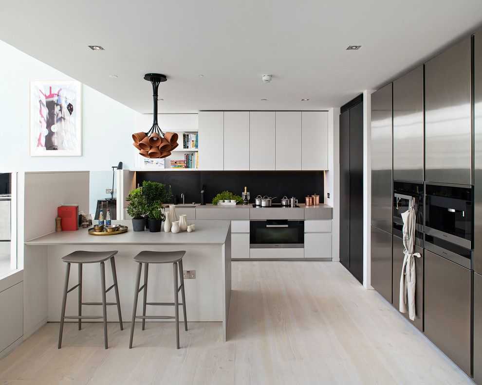 Также от ощущения стерильности избавят дополнительные один-два цветных или темных акцентов. Темные цвета даже помогут «увеличить» пространство. Так, например, черный фартук на фоне белых фасадов гарнитура будет будто бы «проваливаться», придавая пространству объем и глубину.