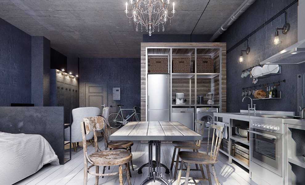 Тоже лофт, но уже с преобладанием серого и темно-синего цветов