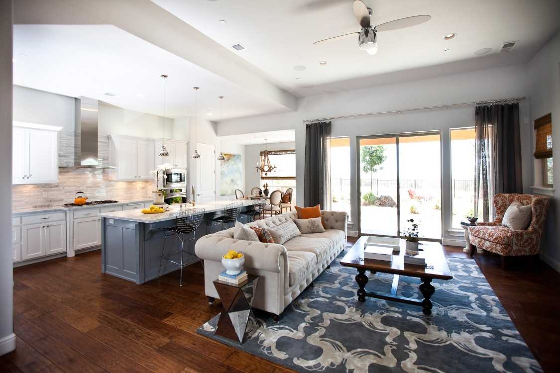 Удобно, когда гостиная имеет большие габариты. В ней найдется много места для спокойного отдыха, а зона кухни благодаря многофункциональному острову сможет выполнять функцию бара. При этом размеры самой кухни остаются оптимальными — при готовке не нужно бегать туда-сюда. Все необходимое оказывается под рукой.