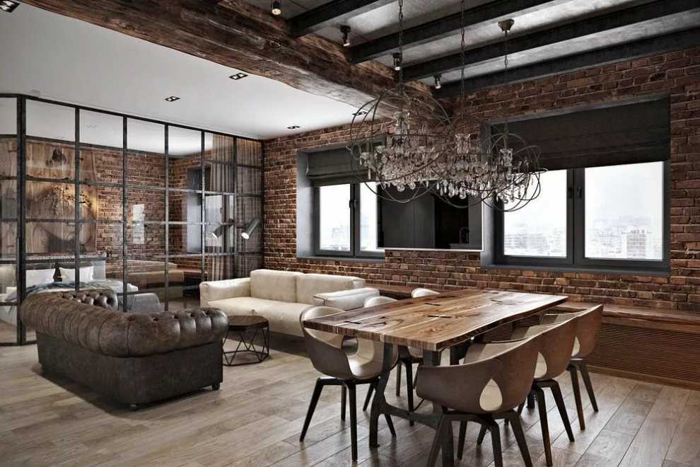 Кирпичные оттенки в кухне-гостиной лофт-стиля