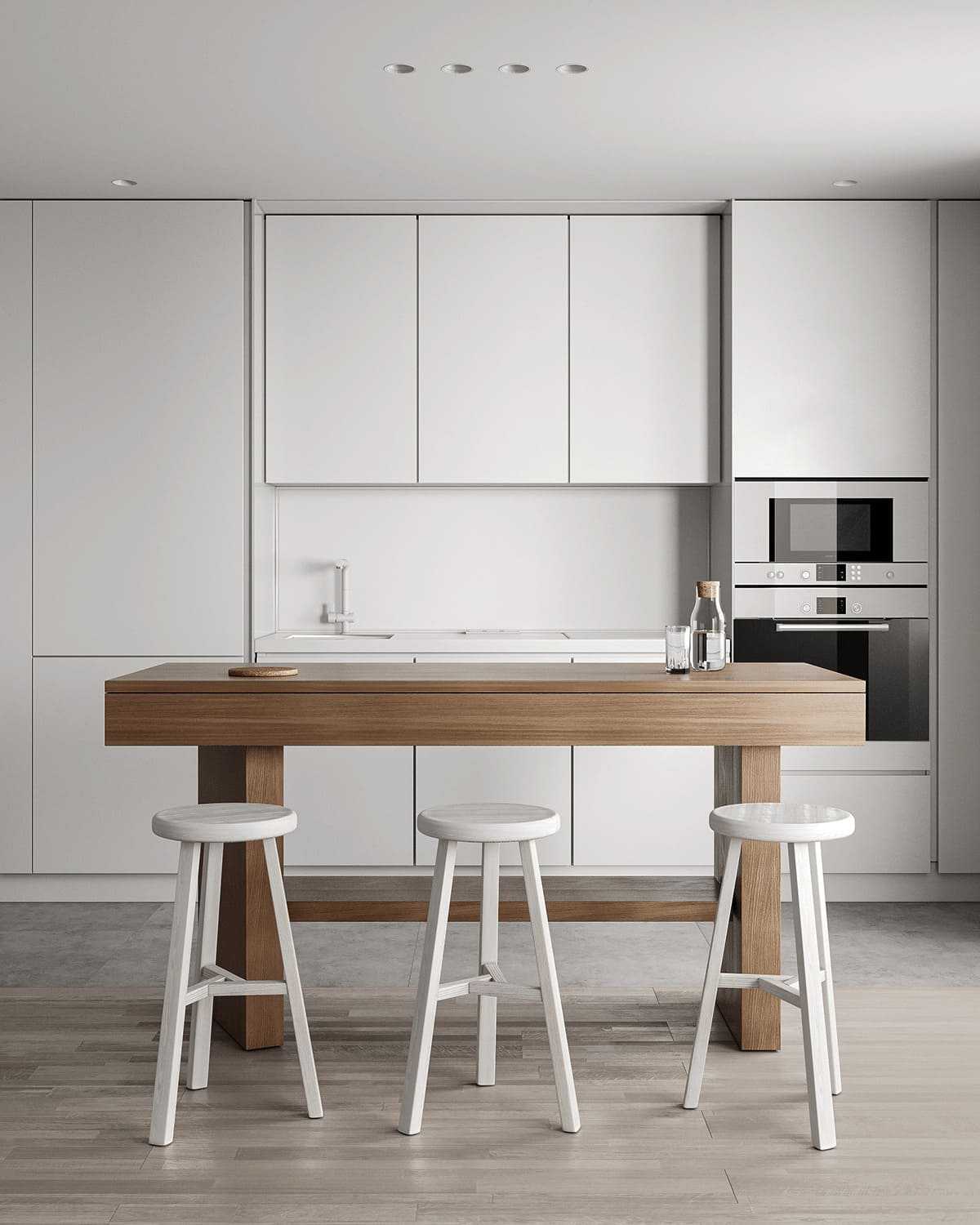 Кухня столовая с линейной планировкой и барной стойкой в качестве обеденного столаИсточник dekor.expert