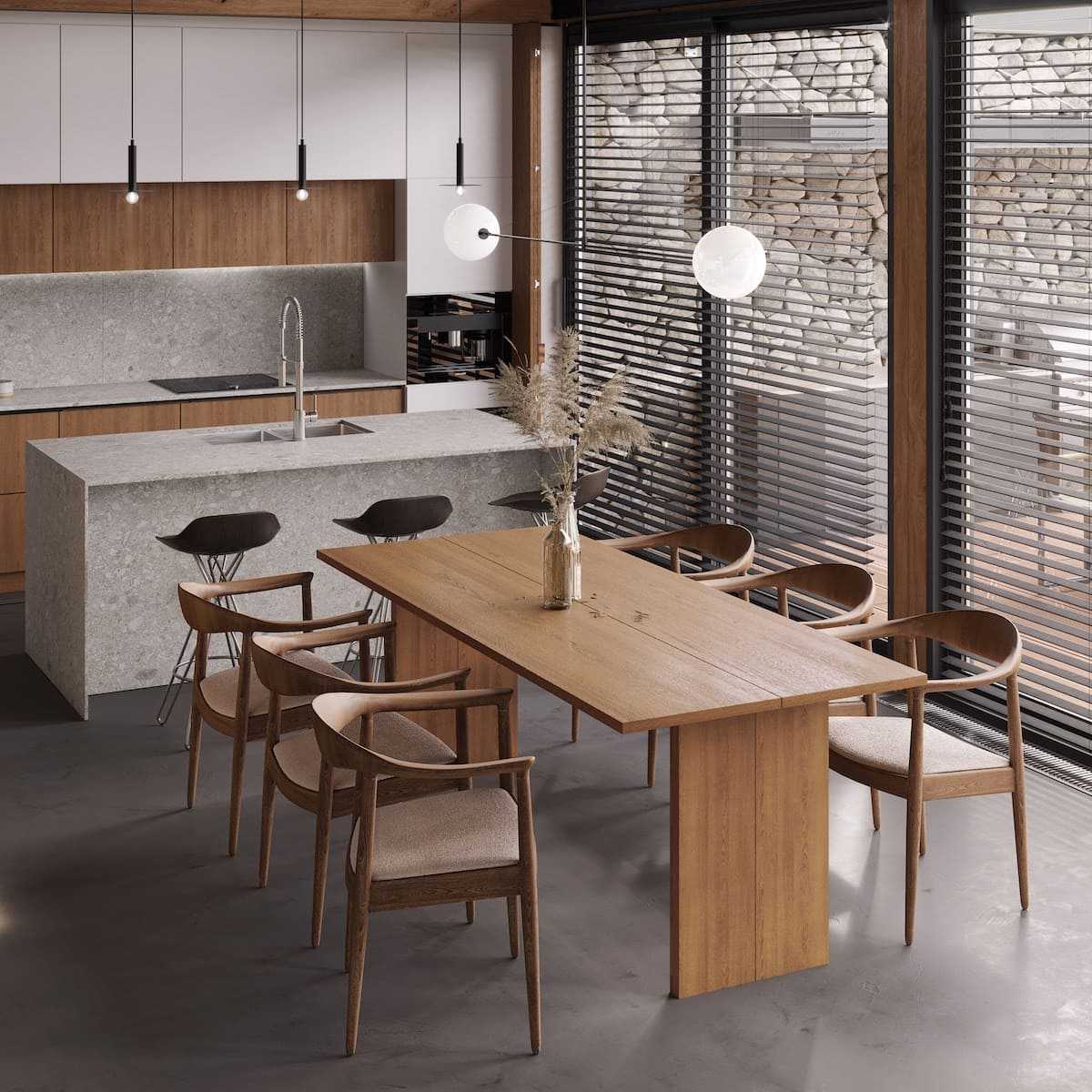 Кухни, оформленные в этом стиле, отличаются простотой и максимальной функциональностью. Хотя эта тенденция уходит корнями в модернизм, она не обходится без сложной игры формы и текстуры. Обстановка в атмосфере середины века наполнена благородными материалами, выдающимся дизайном (вот почему мы часто обращаемся к винтажным элементам, которые являются иконами дизайна) и мастерством на высшем уровне.