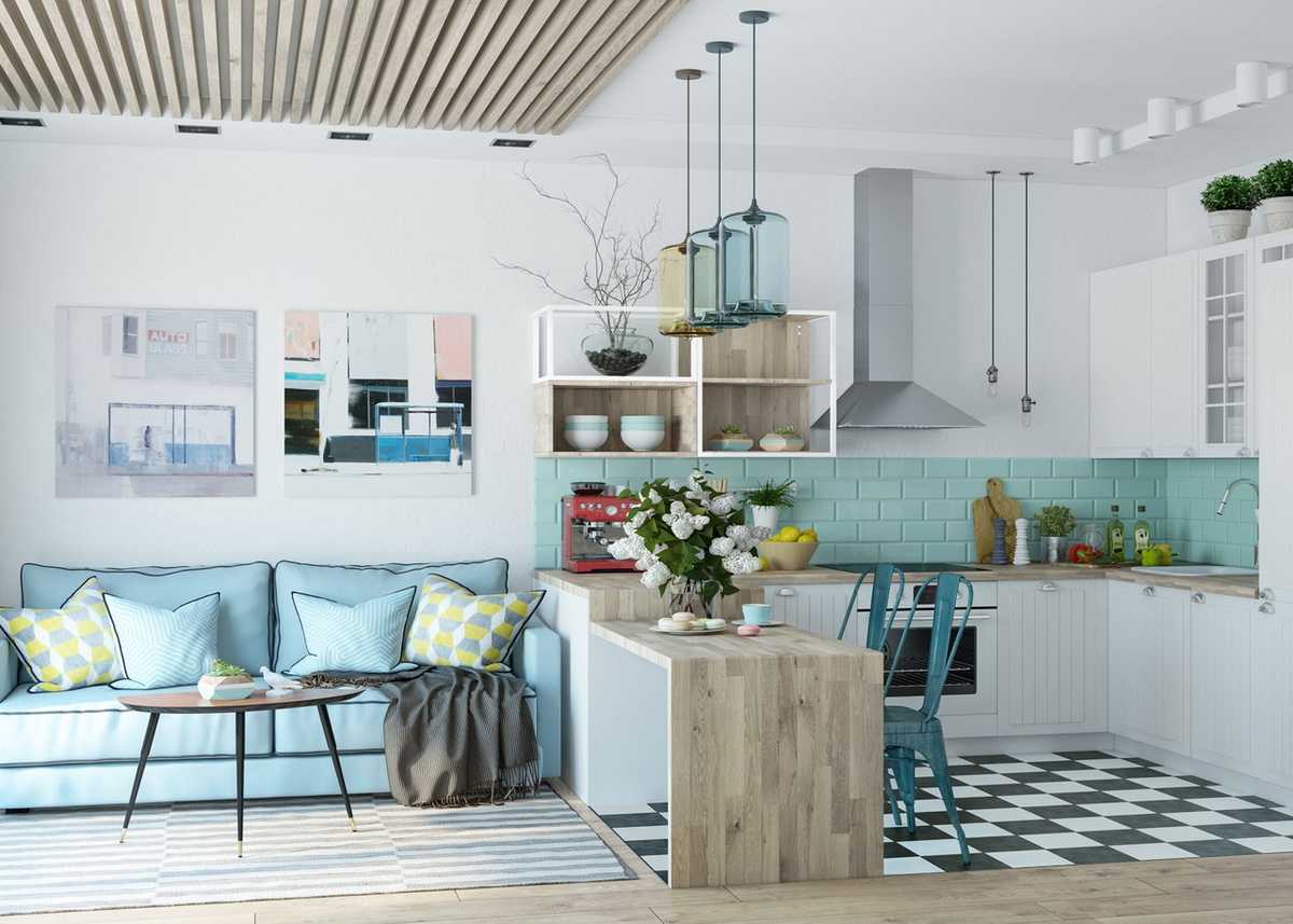 На фото кухня-гостиная, выполненная в светлых голубых, белых и бежевых тонах.