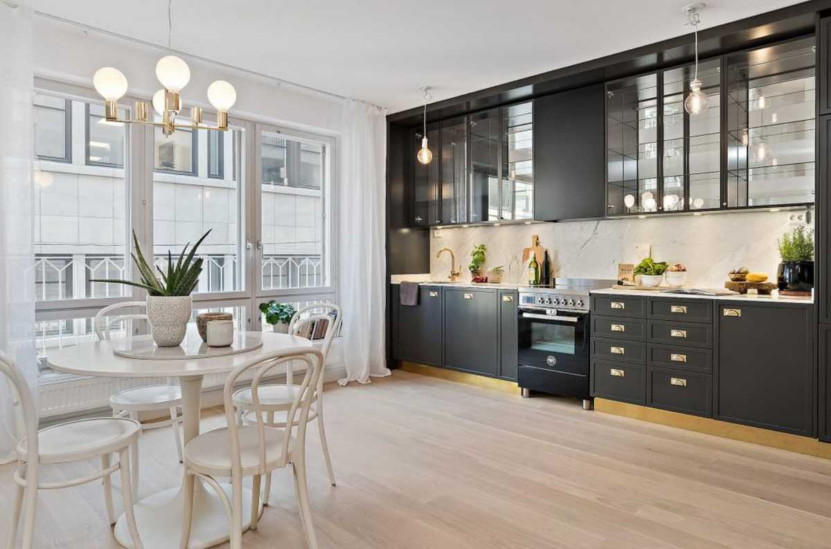 Имея большую площадь или два помещения чаще даже не приходится задумываться о том, как правильно все организовать. Достаточно совместить две комнаты и оформить их в едином или приближенном дизайне кухни-столовой