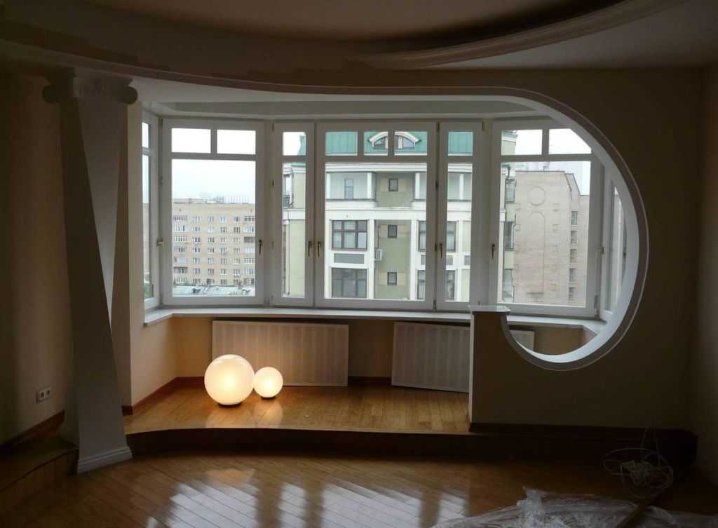Иногда нет возможности демонтировать порог, уровень балкона выше пола в комнате. Тогда делают невысокий пьедестал прямоугольной или фигурной формы.