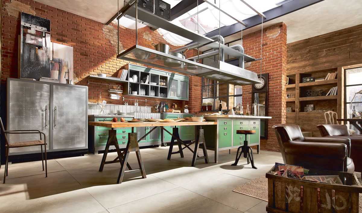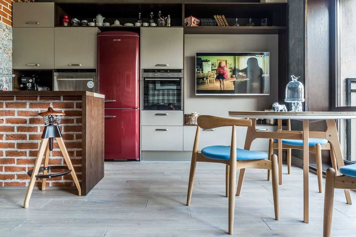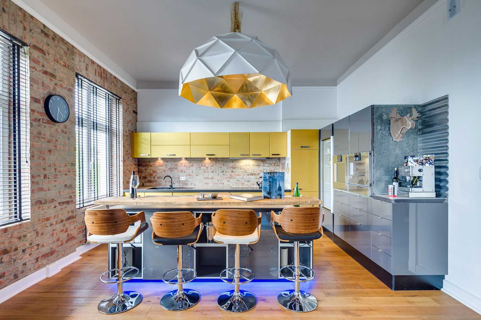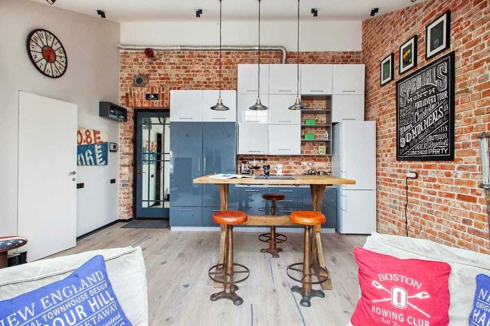 Сочетание современной мини-кухни с модными отделочными материалами, например, сырым кирпичом или бетоном, всегда выглядит фантастически. Интерьер изящный и престижный благодаря своей простой договоренности. Кухня с барной стойкой создает единство из-за расширения столешницы, однако, данная деталь интерьера может быть немного выше, чем остров, и таким образом вы с легкостью можете скрыть все, что происходит на кухне от людей, находящихся в гостиной. Это несомненное преимущество барной стоки! Стулья в таком случае лучше подобрать из натуральных материалов, которые придадут благородный вид всей стилизации.