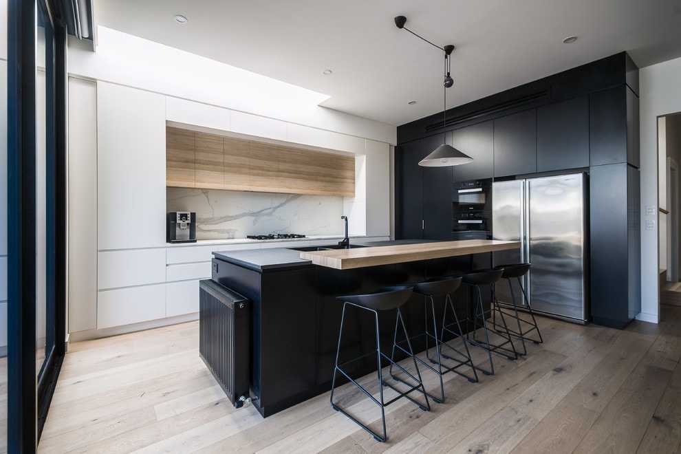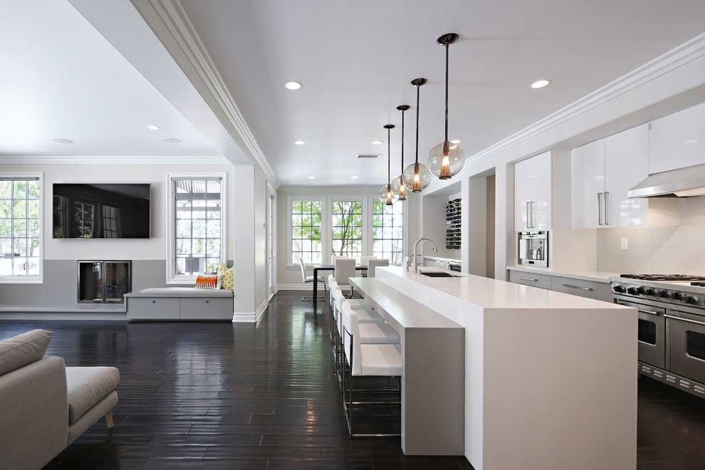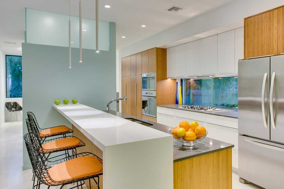 Другой способ обустроить кухню с барной стойкой — это расширить остров или столешницу. Следует помнить, что бар должен быть немного выше, чтобы вы могли комфортно сидеть на высоких стульях. Опять же, конструкцию можно использовать в качестве дополнительного верха или места для обслуживания блюд. Вместе с островом барная стойка образует символическую границу между кухонной частью и гостиной. Если места достаточно, то стойка заполнит его хорошо, привлекая своей красотой и функциональностью.