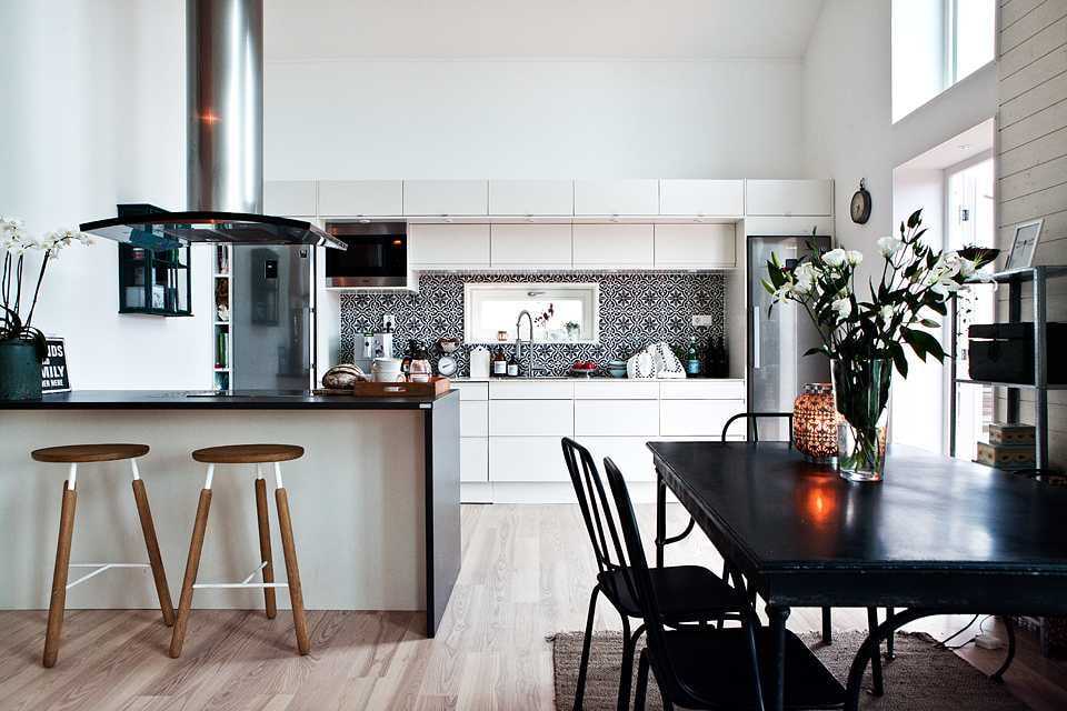 Еще одна идея для размещения кухни с баром — это расширение кухонного острова, который может находиться в центре всей комнаты, соединяющей кухню с гостиной. Мини-бар с необычными высокими стульями — это красивое дополнение и функциональное использование пространства. Если на кухне курите, разговаривая с одним из членов семьи или гостями в зале, то барная стойка — подходящее место для проведения комфортного диалога.