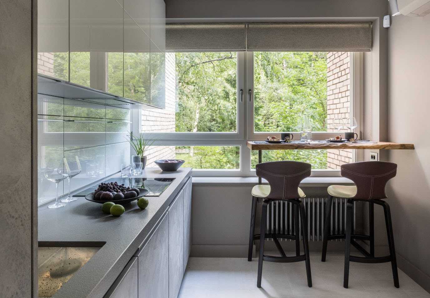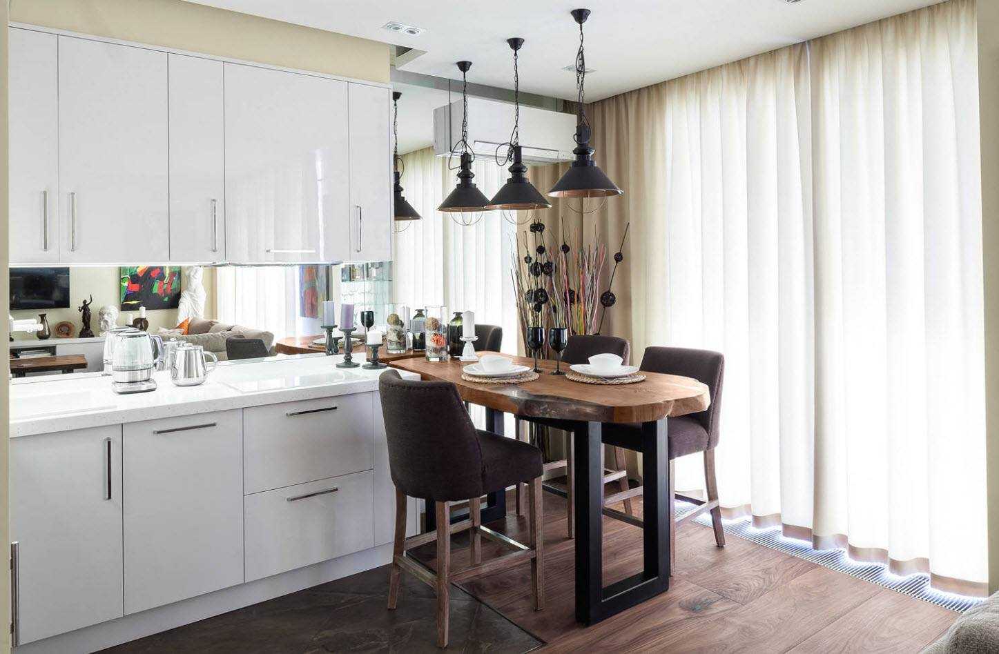 В небольших апартаментах не всегда есть место для столовой. Однако, еда на низком столике в гостиной — не очень хорошая идея. Если вы хотите отделить кухню от гостиной и в то же время получить в этой ситуации комфортное место для еды, это лучшее решение — барная стойка. Несмотря на то, что кухня узкая, вы всегда сможете скрыть барные стулья под столешницей и, следовательно, они не будут занимать ценное пространство. Обычно на таких уютных конструкциях помещаются два человека, что очень удобно для малой семьи. Если вы хотите разместить больше гостей, тогда барная стойка должна быть расширена, чтобы у каждого было немного места для себя.