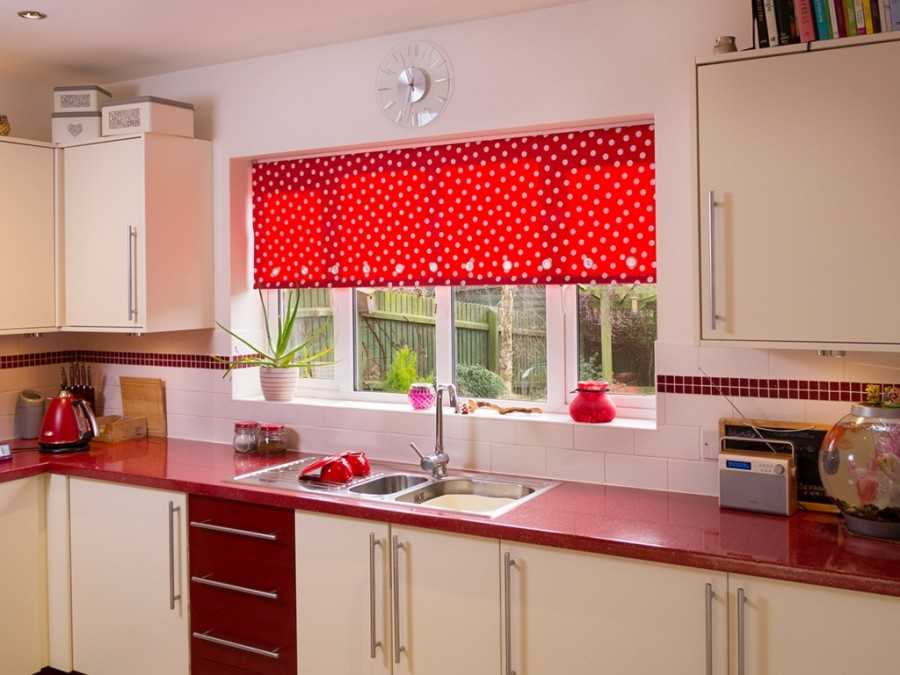 В маленькую кухню лучше подбирать шторы тёплых оттенков. Особенно если окна выходят на тёмную сторону.