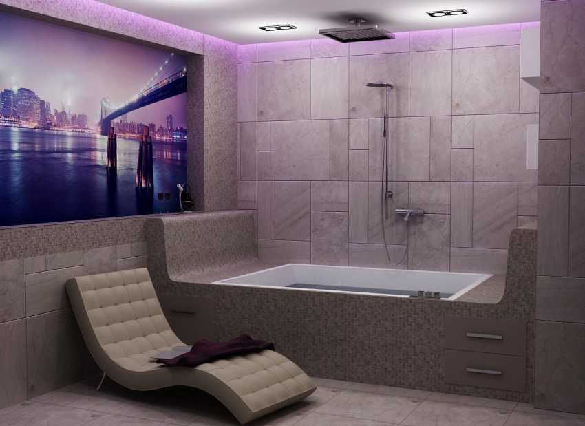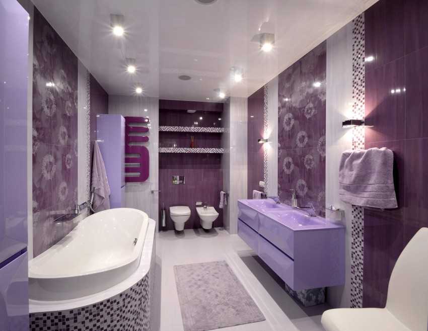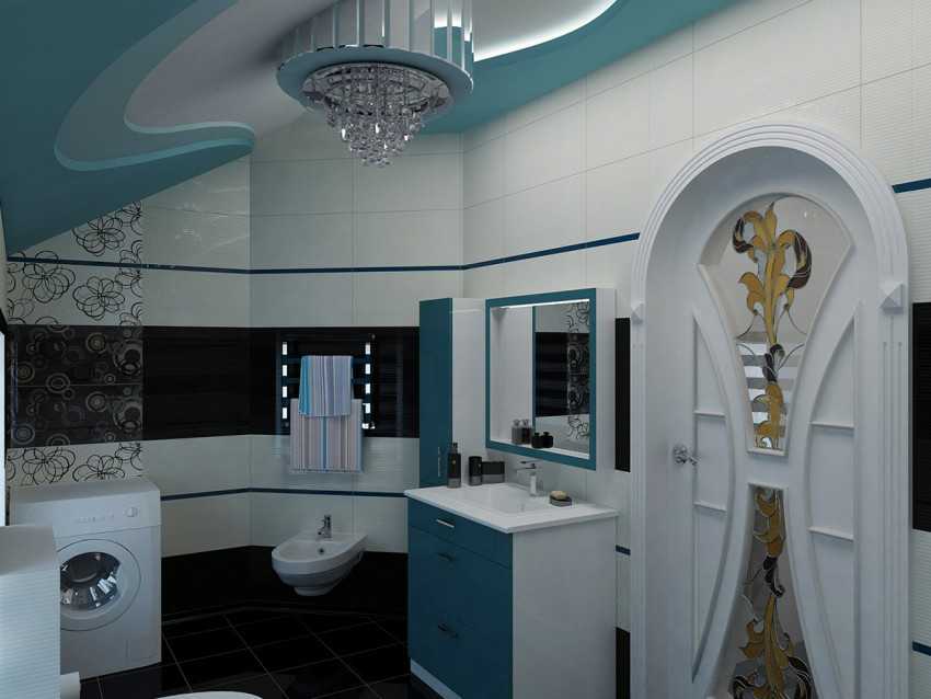 Даже если в ванной комнате есть окно, требуется правильно смонтировано освещение. Оно должно иметь несколько уровней, что будет более практично и удобно. Для общего освещения и при довольно большом помещении в центре потолка можно разместить люстру.