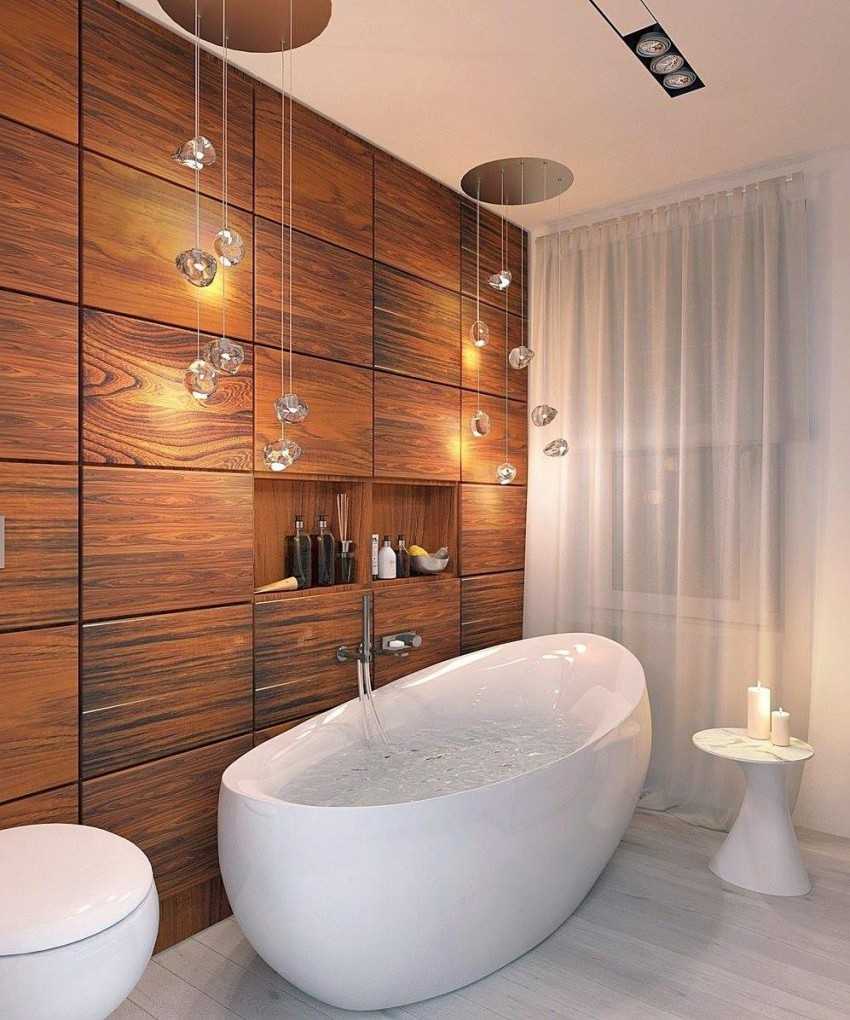 Оригинально выглядят лампы в виде круглых плафонов, которые спускаются с потолка на длинных шнурах. Их количество будет зависеть от площади ванной комнаты.