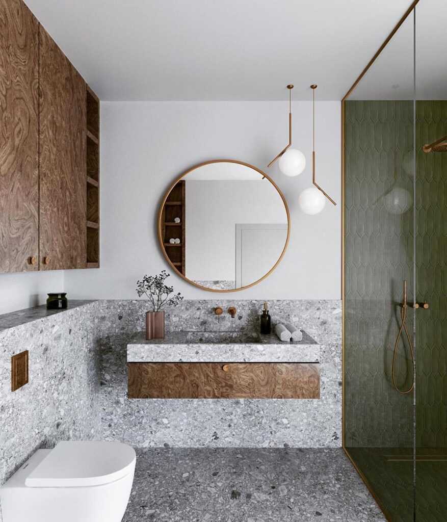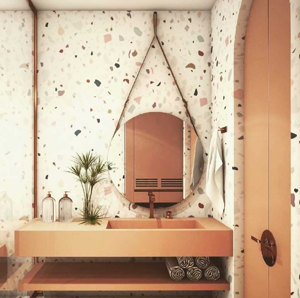 Возврат к трендам десятка или даже нескольких десятков лет назад по-прежнему велик. Один из них, особенно хорошо адаптированный для ванных комнат — это мотив терраццо. Терраццо изначально представляет собой смесь цемента, воды и песка. Со временем в него добавляли цветные красители, другие виды мелких камней и даже цветное стекло, из которых складывались все более интересные композиции.
