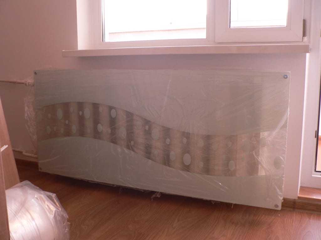 А вот стекло для декоративной решётки для радиатора отопления – вариант не самый ходовой. Несмотря на свою универсальность (на эту поверхность можно нанести любой орнамент, фото или изображение), стекло хрупкое и маркое