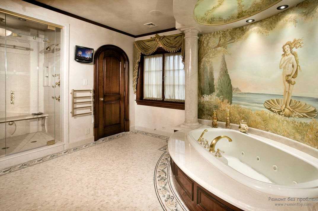 Рисунком можно разделить помещение на зоны или создать акцент. Выбирать тематику изображения нужно исходя из стиля помещения. Для классического интерьера можно использовать известные картины, стилизованные портреты по фото, исторические панорамы, цветы, лик святого. Также из фресок можно сделать иконостас. Для потолка подойдет рисунок неба с облаками, летящими птицами или ангелами.