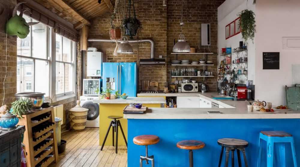 Лофт – в этом интерьерном направлении синий применяется в качестве дополнительного. Синий отлично выглядит на фоне кирпичных либо серых штукатуренных стен. В стильной кухне лофт уместны будут синие гарнитур и обеденная группа.