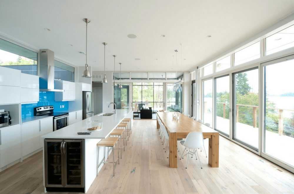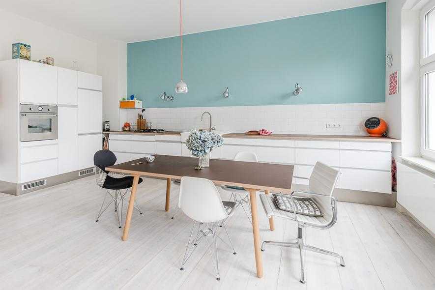 Он привлекает к себе внимание, как только человек входит в комнату. В голубой кухне идеально будет смотреться стол с белой столешницей