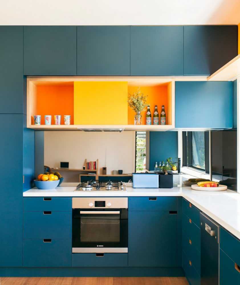 Синяя рабочая поверхность требует теплоты и яркости на стенах. Поэтому при оформлении часто можно увидеть, как экспрессивные оранжевые стены соседствуют с приглушенными и, на первый взгляд, недружелюбными оттенками.