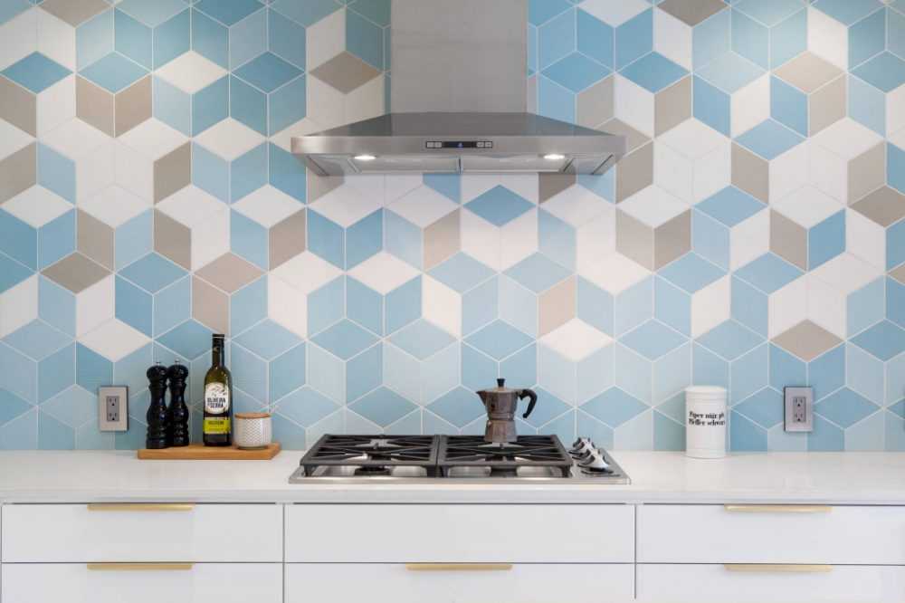 Не забывайте также о плитке «кабанчиком»: 10х30 или 10х20 см. В синем цвете на месте фартука она смотрится необычайно свежо и уютно, особенно на контрасте с белоснежной мебелью.