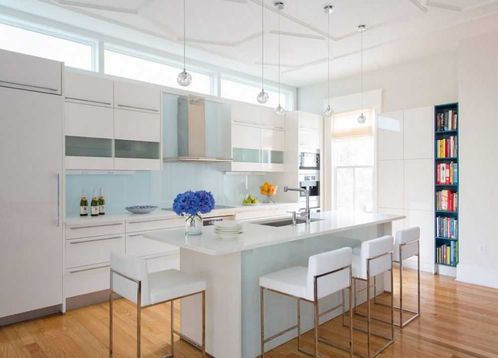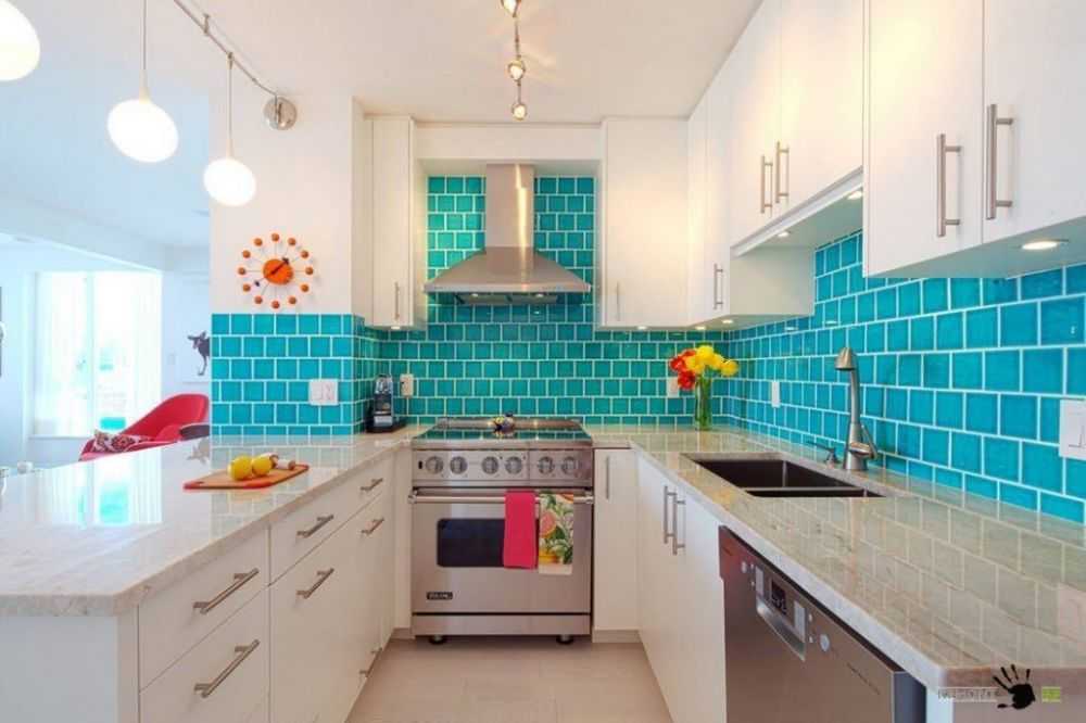 Не стоит загромождать помещение избыточным количеством деталей, ведь главное требование, которое нужно соблюдать – это простор, порядок. На полках можно расставить живые растения, поскольку сочетание голубого цвета с зеленым выглядит поистине прекрасно и достойно. Оригинально будет выглядеть белая кухня с голубым фартуком, для оригинальности помещения последний может быть выполнен в нескольких тонах.