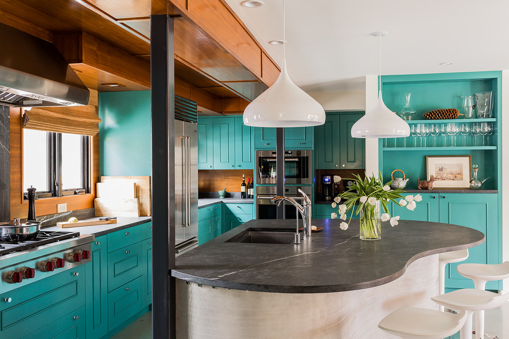 Бирюзовый кухонный остров отлично вписывается в общую атмосферу