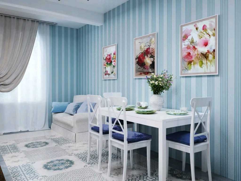 Какие должны быть размеры рисунка? В этом случае стоит ориентироваться на площадь помещения. Чем она уже, тем меньше должен быть рисунок или узор. Если ваш выбор пал на растительный и цветочный орнамент, то использовать такие голубые обои для оформления помещении любого стиля. Традиционный орнамент с вензелями применяют для оформления интерьера кухни, выполненной в классическом стиле.