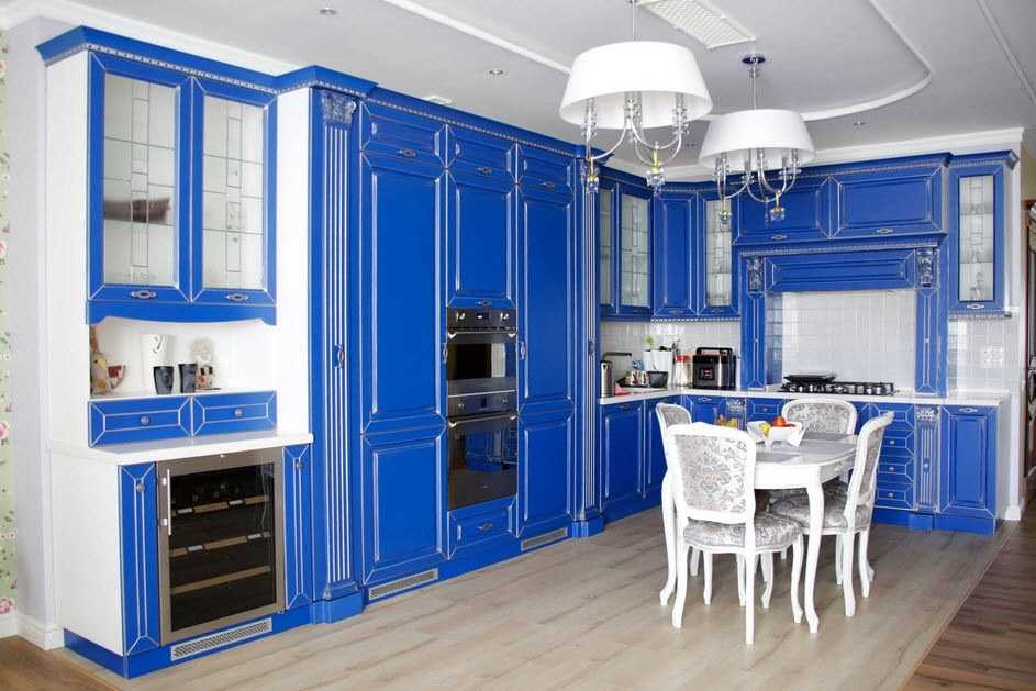 Классика – здесь синий может присутствовать в шторах и скатерти, а вот гарнитур лучше выбрать из дерева. Синими в такой кухне могут быть декоративные элементы и люстра.