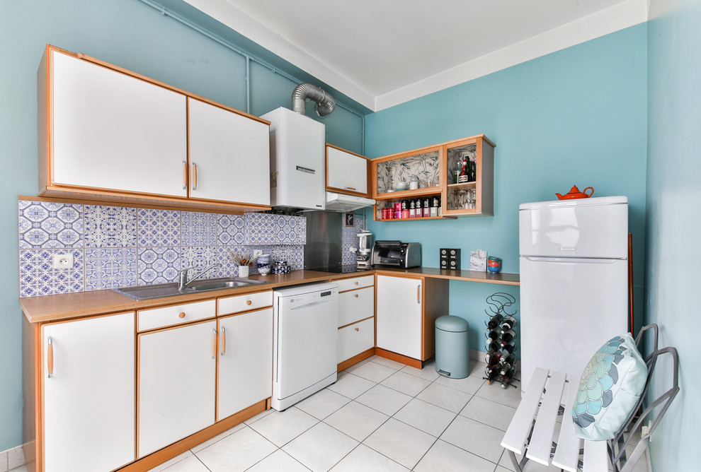 если кухня маленькая, то светло-голубой или светлый серо-голубой – лучший тон краски для стен или обоев, так как они визуально увеличивают пространство и не «гасят» естественное освещение. Кроме того, с таким спокойным фоном вы сможете часто экспериментировать и видоизменять дизайн кухни, заменяя только декор, текстиль и некоторые предметы мебели;