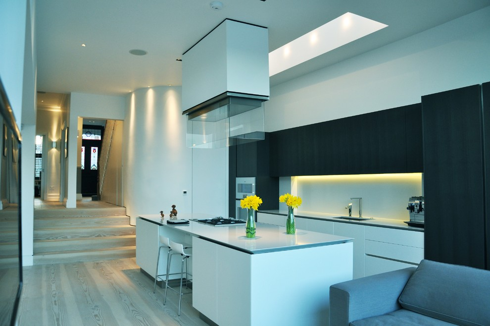Можно и вовсе обойтись без верхних шкафов — получите больше воздуха в помещении.