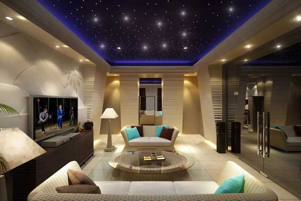 точечные светильники. Эти устройства приходят на помощь, если вам нужно получить равномерное освещение всех уголков комнаты. В ситуации, когда в гостиной используется натяжной потолок, такие споты будут более, чем уместны.