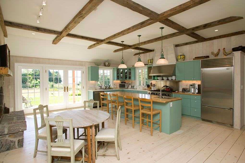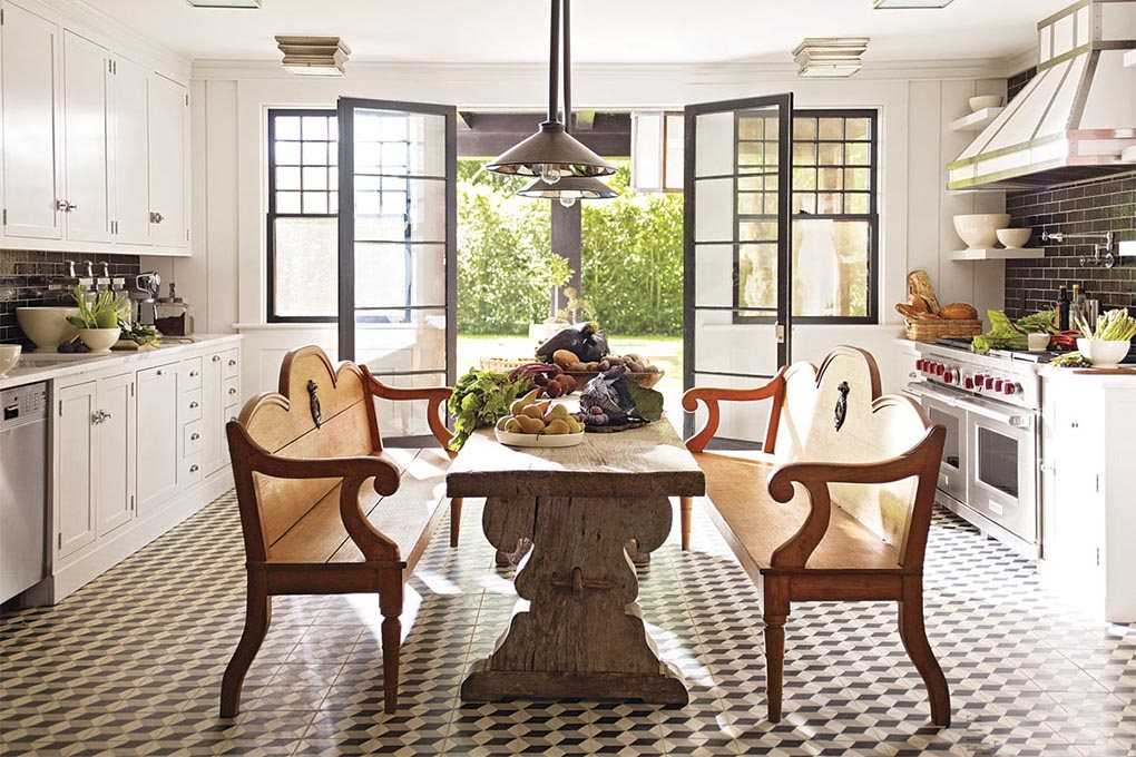 - Кроме места приготовления еды, еще должна быть обеденная группа — стол со стульями, а также зона для отдыха, оборудованная мягкой мебелью. Здесь же может размещаться телевизор.