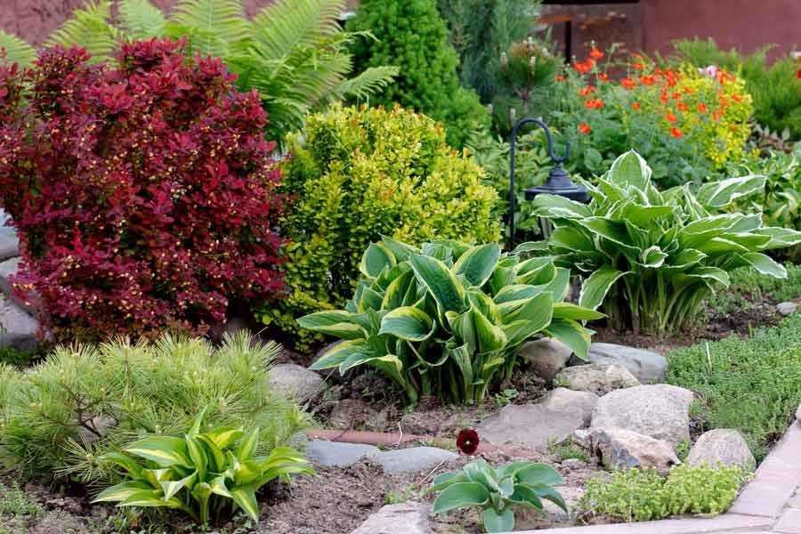 Гейхеры и хосты на клумбе Источник moyadachya.ru