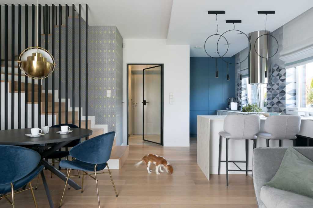 Вы также можете выбрать проверенные цветовые решения, например, приглушенные, классические интерьеры, темно-синий с бежевым, но не совсем белый. В более смелых сочетаниях стоит использовать темно-синий с мерцающими оттенками золота, серебра, меди, латуни или олова.