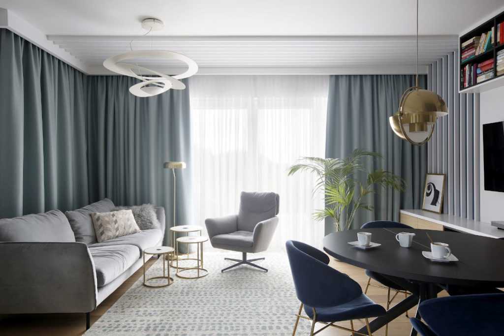Синие стены в гостиной могут стать отличным фоном для мебели и аксессуаров. В зависимости от выбранного оттенка, синий цвет поможет вам составить композицию в современном, скандинавском, провансальском или деревенском стиле. Оттенки синего подойдут для многих интерьеров. Их светлые холодные тона удачно увеличат размеры даже небольшой гостиной. Голубой цвет на стенах выглядит красиво в сопровождении белого и нейтрального бежевого. Такое эффектное сочетание понравится многим людям, а неподвластный времени характер синего цвета и его положительное влияние на настроение семьи сделают его идеальным выбором на долгие годы.