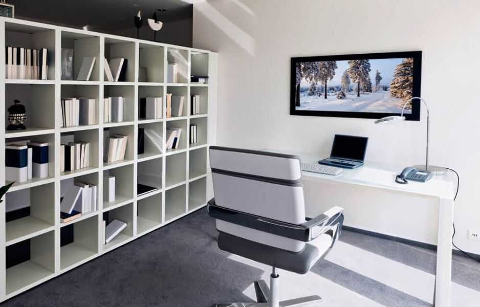 Также зонирование можно осуществить с помощью мебели и стеллажей. В этом случае мебель позволит более эффективно разместить все офисные принадлежности и технику, однако такой вариант не позволит быстро трансформировать планировку комнаты.