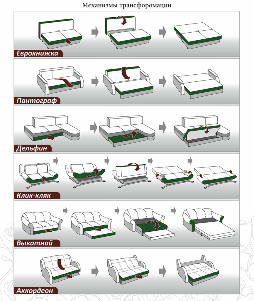 Диваны раскладываются с помощью различных механизмов.