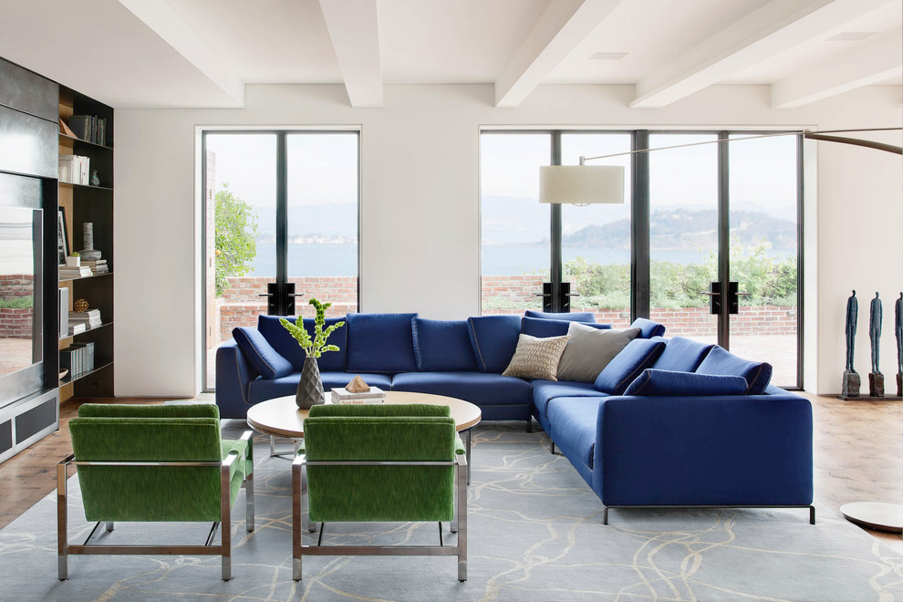 Кухня-гостиная в стиле арт-деко с синими диванами