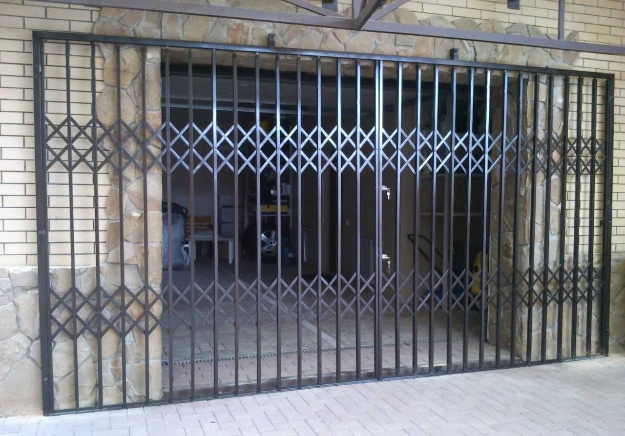 - Раздвижные решетки на окна для дачи – конструкции, отличающиеся наибольшим удобством в применении. Они могут быть открыты и закрыты посредством одного движения руки, а оригинальное расположение прутьев позволяет им складываться гармошкой. Такие изделия обладают удобством с позиции защиты оконных конструкций, а также они полезны для дверей. Существенный недостаток – отсутствие декоративной опции и возможности создания оригинального неповторимого рисунка. Да и защищенность, обеспеченная данной конструкцией, весьма средняя, ведь для исправности работы механизма используются тонкие прутья в виде пластин, легко поддающиеся поломкам.