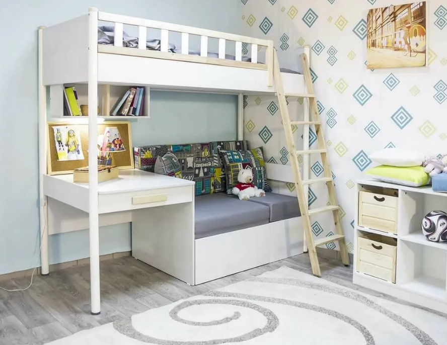 Идея для маленькой комнаты кровать-чердак на верхнем ярусе и диванчик для гостей внизу