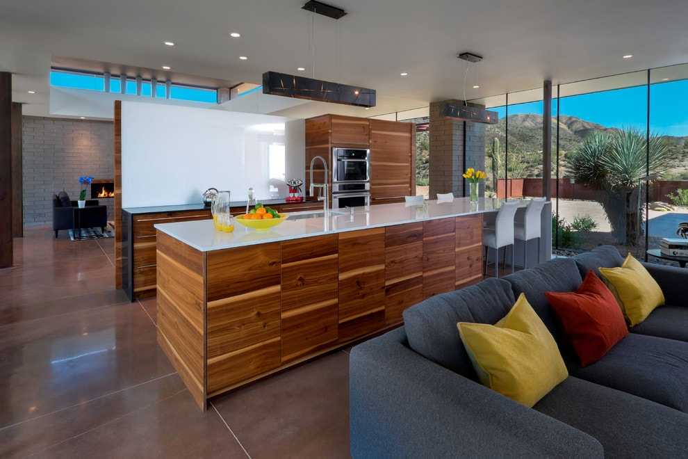Для выделения одной из зон можно использовать многоуровневый пол. Обычно пол приподымают в районе рабочей зоны. Подобный подиум может выполнять не только декоративную функцию. В него можно встроить ящики для хранения различных предметов или эффектную подсветку. Основной минус подиума — риск споткнуться о подиум невнимательному члену семьи или гостю. Интерьер кухни, совмещённой с гостиной, с подиумом в загородном доме можно увидеть на фото.