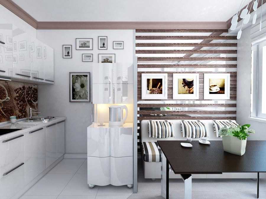 В кухне стены подвергаются воздействию пара, влаги, брызг жира, поэтому для отделки стен рекомендуется использовать такие материалы, как керамическая плитка, краска или моющиеся обои. Они не боятся повышенной влажности. Стены гостиной могут кардинально отличаться от стен кухни или быть отделанными из того же материала. Для оформления двух зон можно подобрать разные цвета, например, для кухни — светло-бежевую гамму, а для гостиной — тёмно-коричневую.